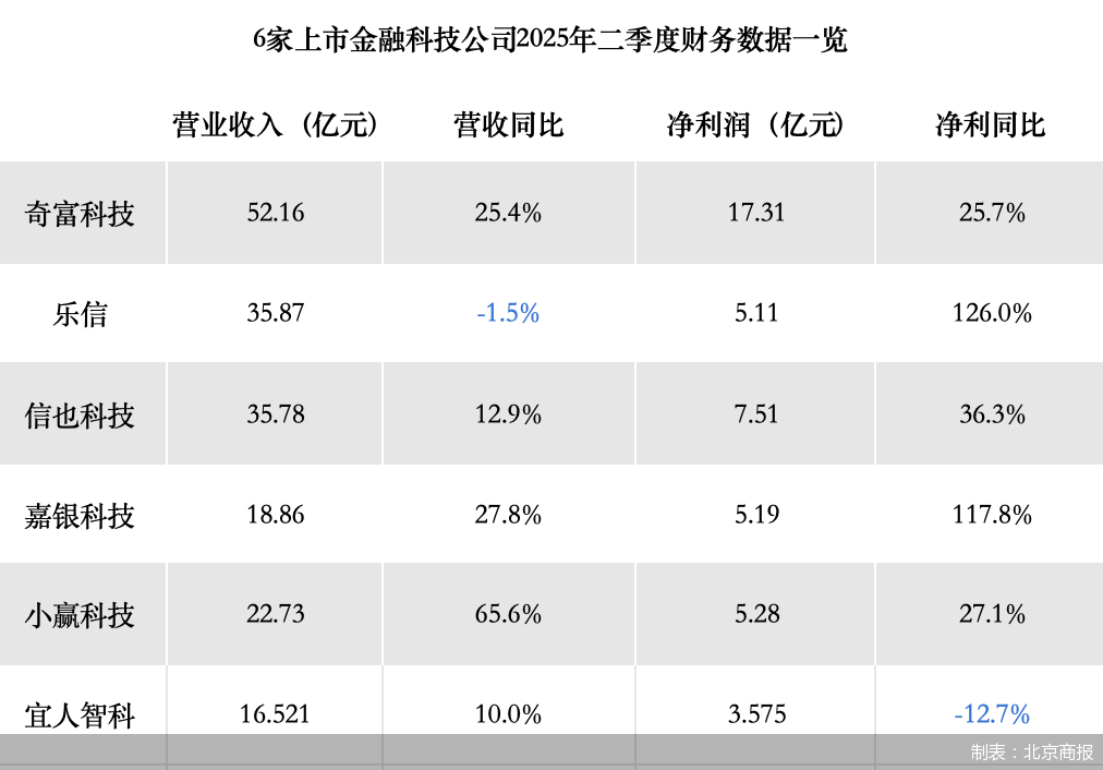 上市金融科技公司2025年二季度业绩陆续发布,北京商报记者梳理发现,6家公司中,多数机构营收、净利润均同比增长,且增幅不小。
